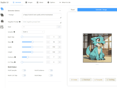 • Since v1.60, provides native image generation with StableDiffusion.cpp, you can load any SD1.5 or SDXL .safetensors model and it will provide an A1111 compatible API to use.