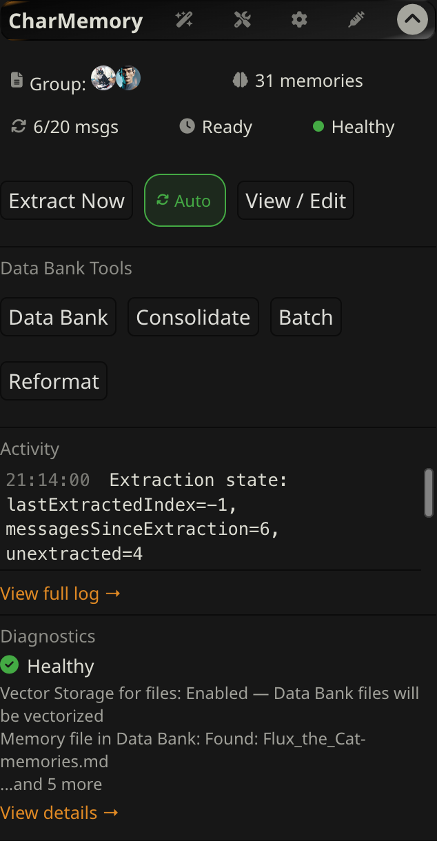 Diagnostics caveat: After generation finishes, SillyTavern resets the active character. If you open Diagnostics between generations, the "Injected Memories" section may appear empty — there's no character context at that moment. This doesn't mean memories weren't injected, just that the snapshot was taken outside a generation turn. Use the Injection Viewer on a specific message instead.